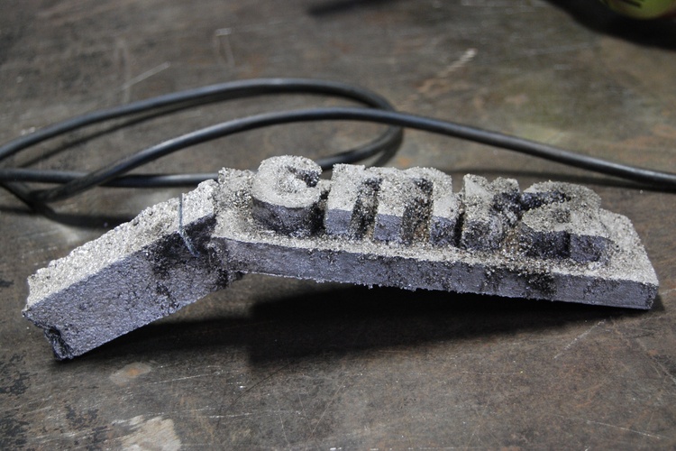 Made in class using the lost foam casting technique and then ground down with a soft wheel on the surface grinder to achieve smooth lustrous lettering.